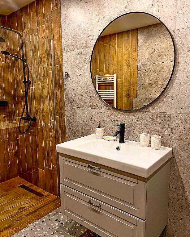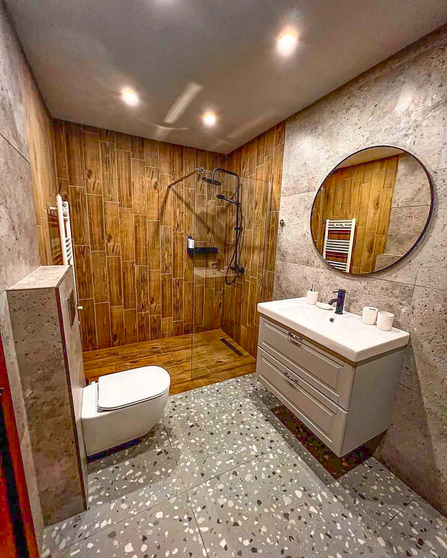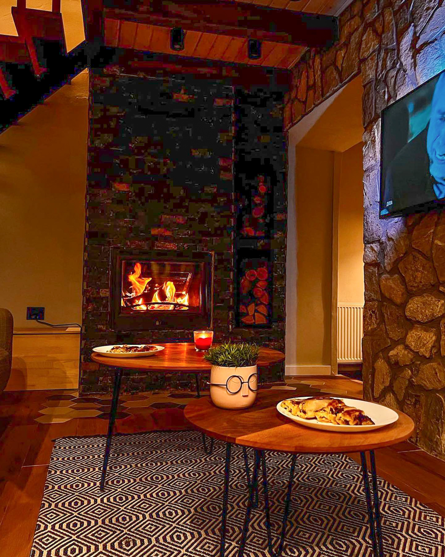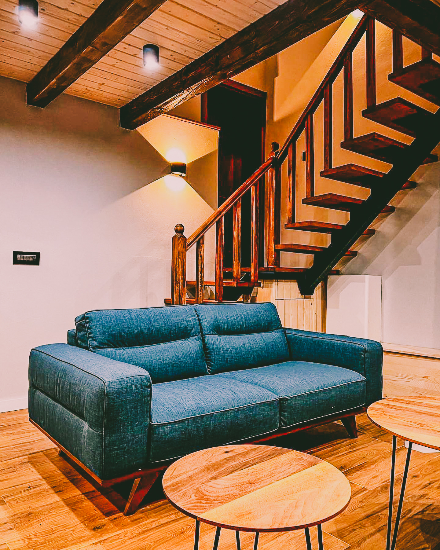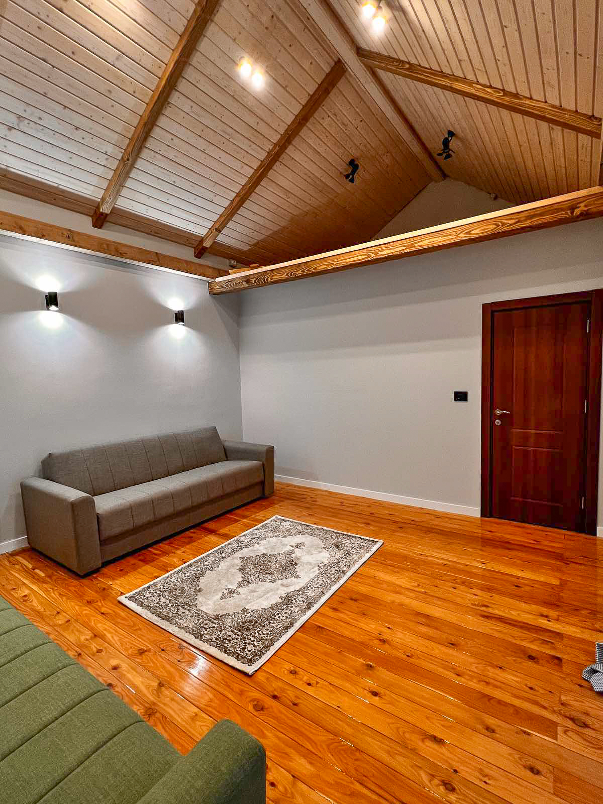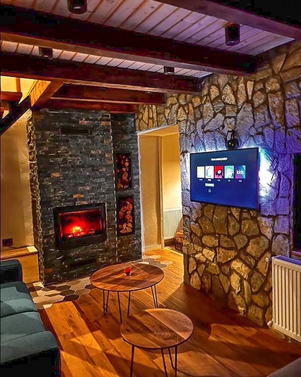Në sallon ka dy divane, televizor plazma dhe oxhak druri. Në kuzhinë ka lavastovilje, furrë dhe sobë, si dhe një tavolinë ngrënie. Në banjo ka një kabinë dushi të madhe.