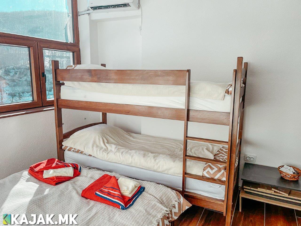 Bëhet fjalë për një dhomë me gjithsej tre krevate: një krevat dopio dhe dy krevate tek në kat.