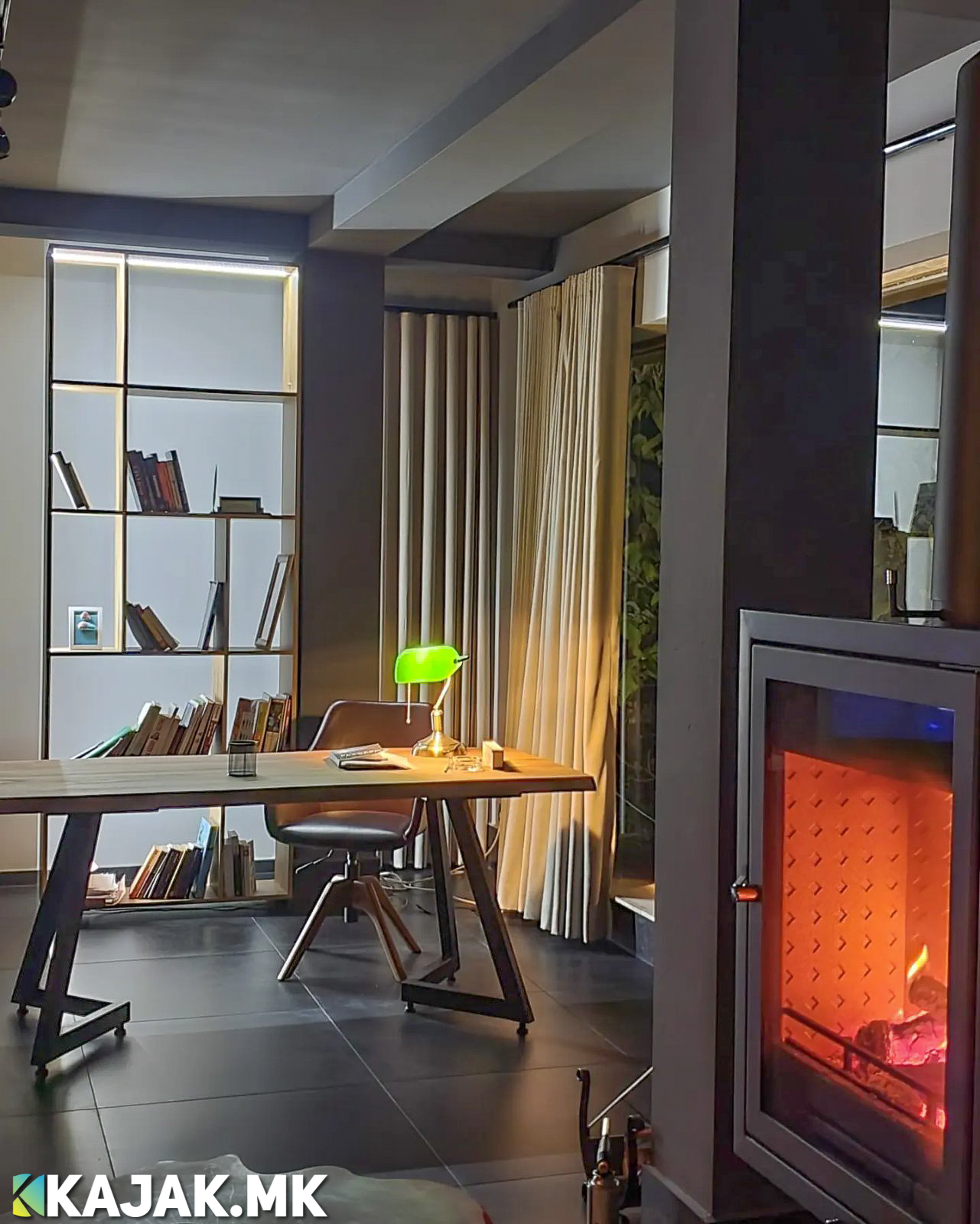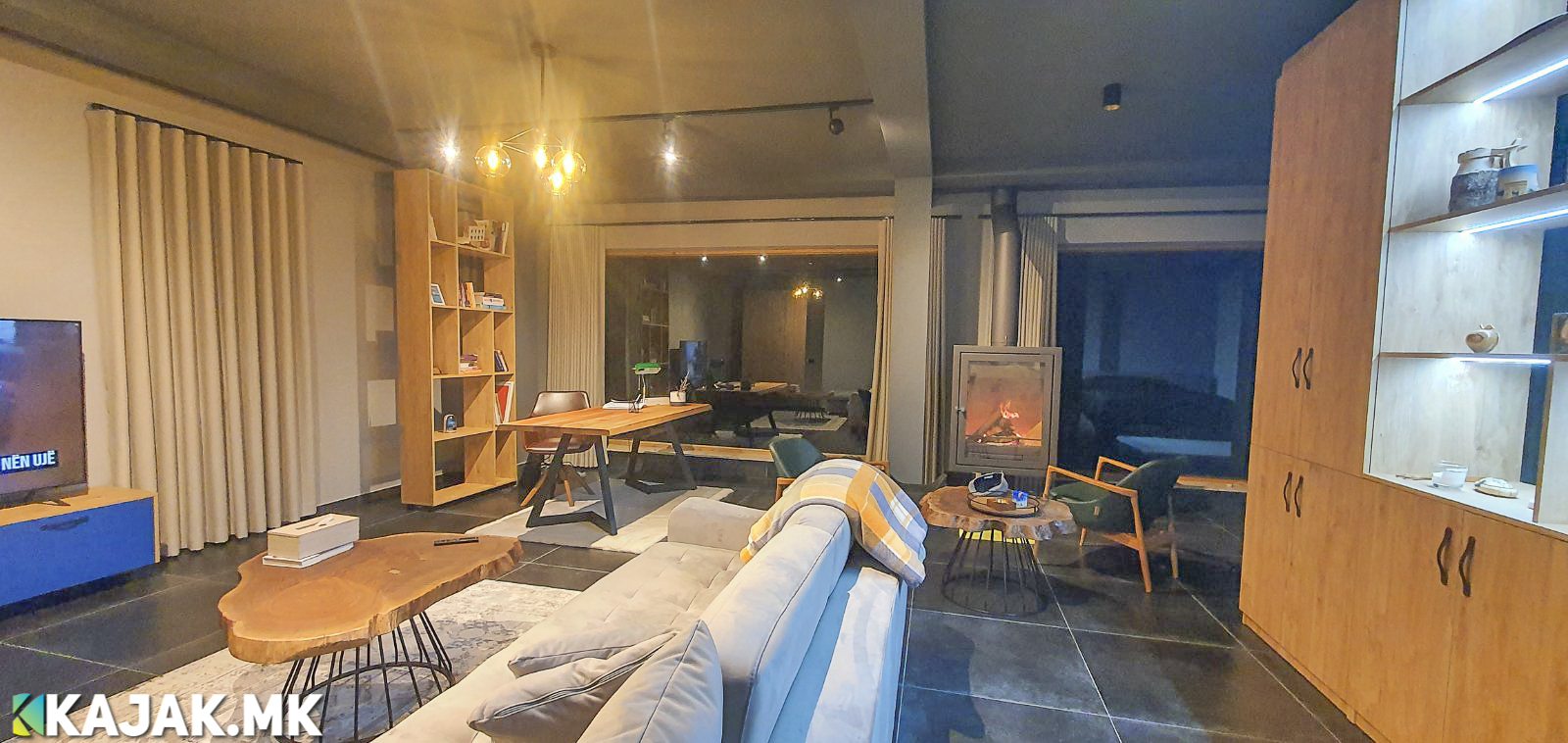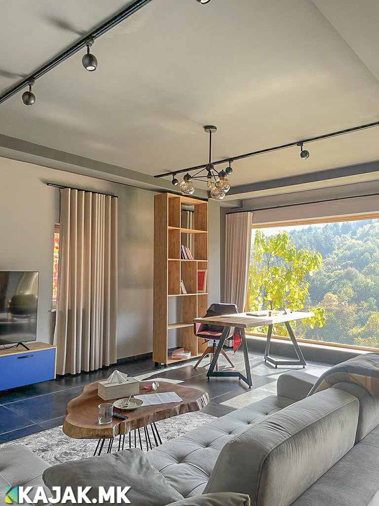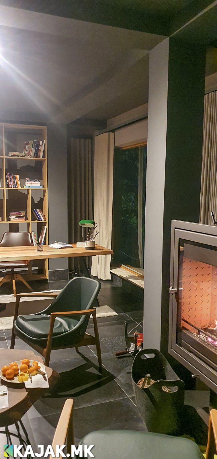 Brenda ka një kamin modern me dru, pamje panoramike nga malet, një bibliotekë të vogël për lexim dhe një tavolinë pune.