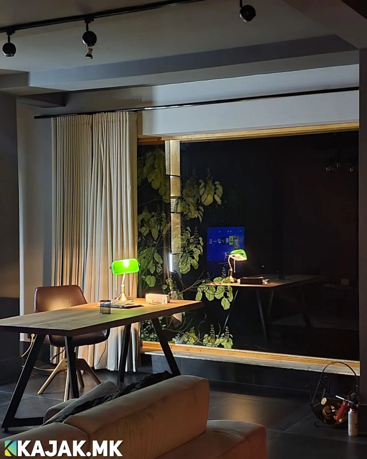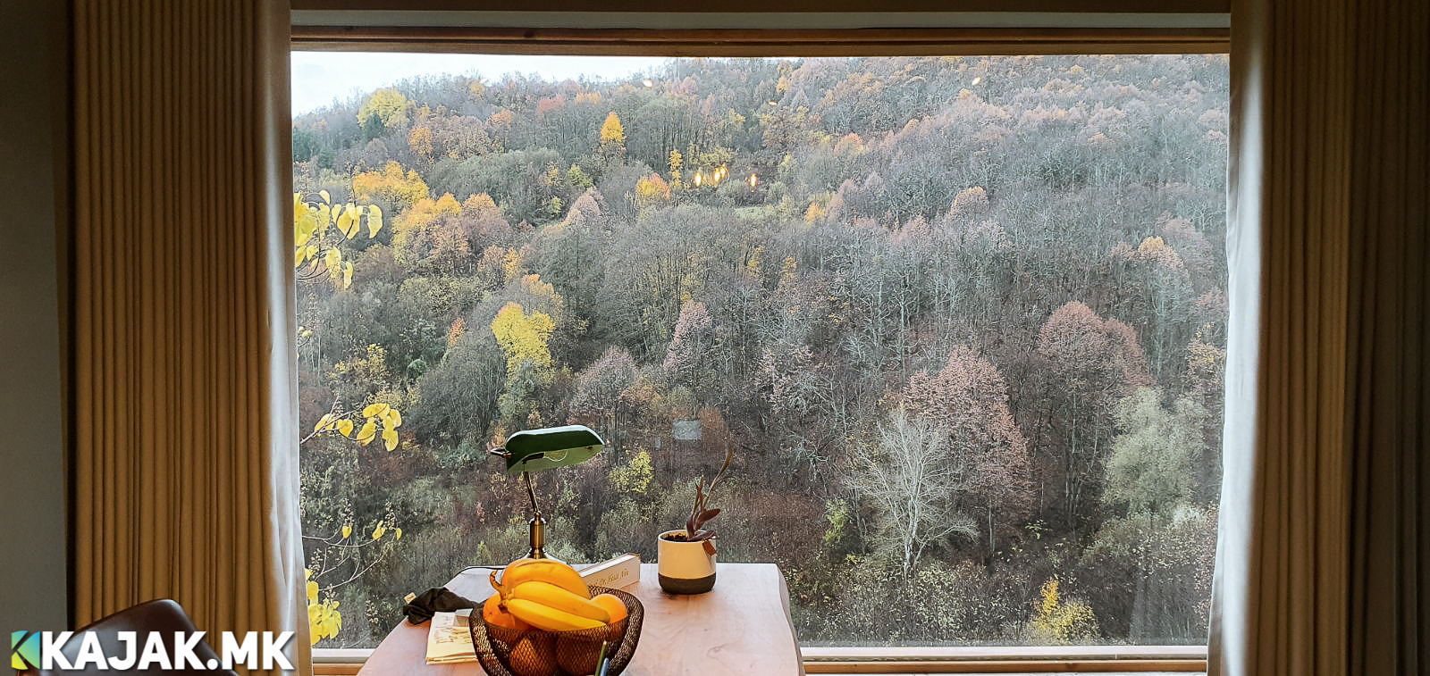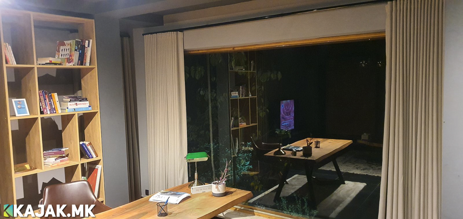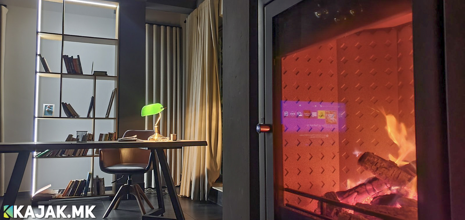 Brenda ka një kamin modern me dru, pamje panoramike nga malet, një bibliotekë të vogël për lexim dhe një tavolinë pune.